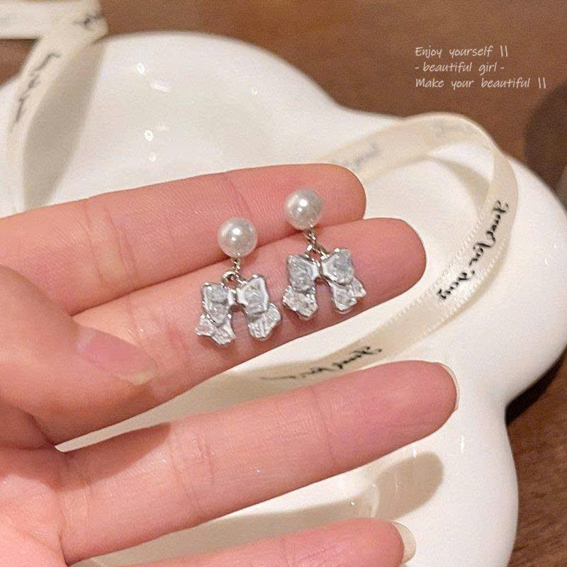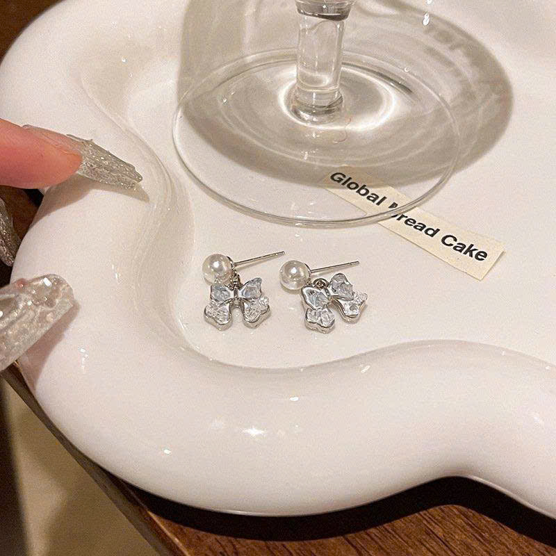Bông Tai Đính Ngọc Nơ Đá Rơi - Chân bạc s925